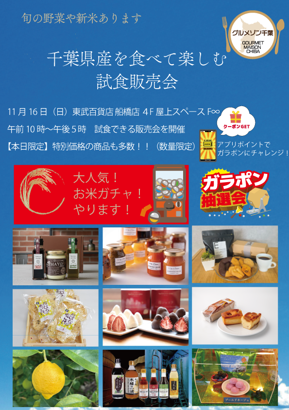 ちばぎん商店は、2025年11月16日(日)に東武百貨店船橋店で開催される「グルメゾンCHIBA」に出店いたします。千葉県内の美味しい農産物と加工品の特選品を「楽しく体験できる」特別なイベントに、ぜひお越しください。