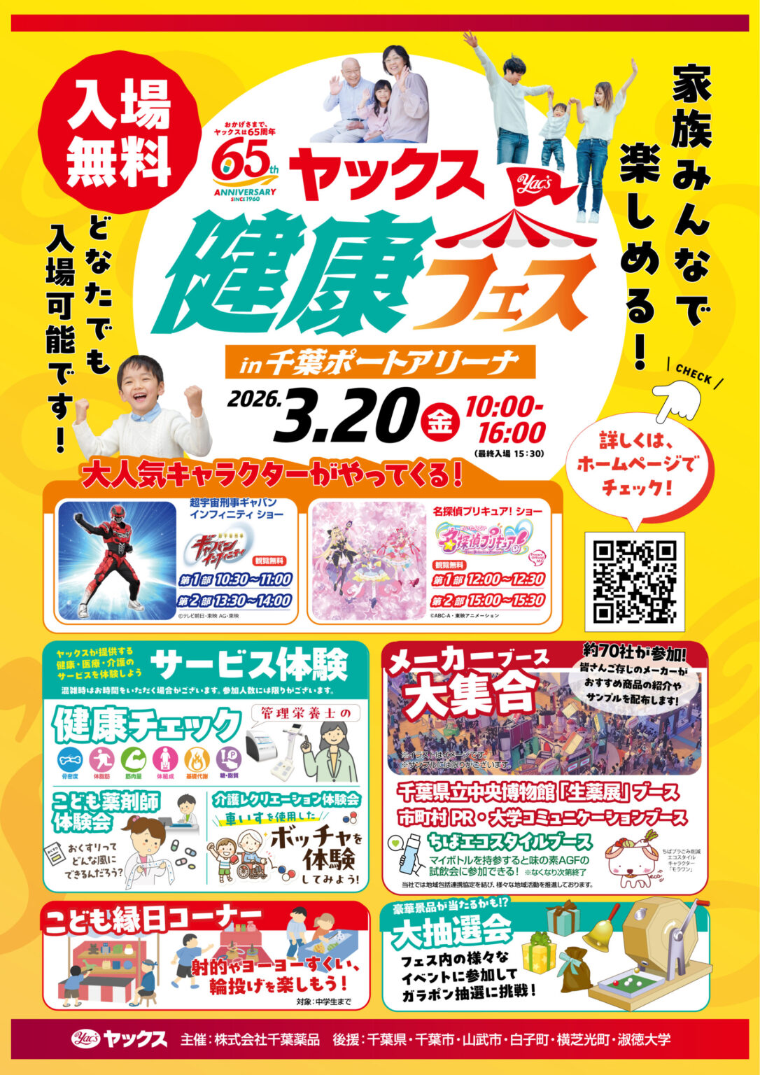 2026年3月20日(金)に千葉ポートアリーナで開催される、株式会社千葉薬品さま主催のイベントヤックス健康フェスに、ちばぎん商店と千葉銀行「ちばの住まいコンシェルジュ」が共同出展します。