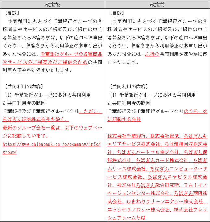 株式会社フレッシュファームちばは2025年3月28日付で千葉銀行のグループ会社となったため、「個人情報のお取り扱いについて(個人情報保護宣言)」における個人データの「共同利用者」の範囲に追加されています。